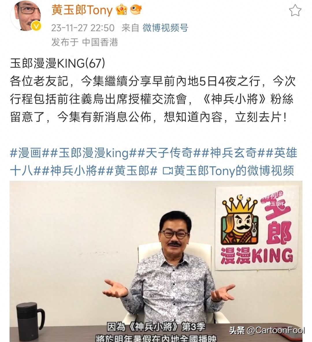 《神兵小将》动画第三季即将回归啦!11月27日,《神兵小将》动画系列的总导演黄玉郎发布了一则视频说即将去往义乌出席授权交流会,