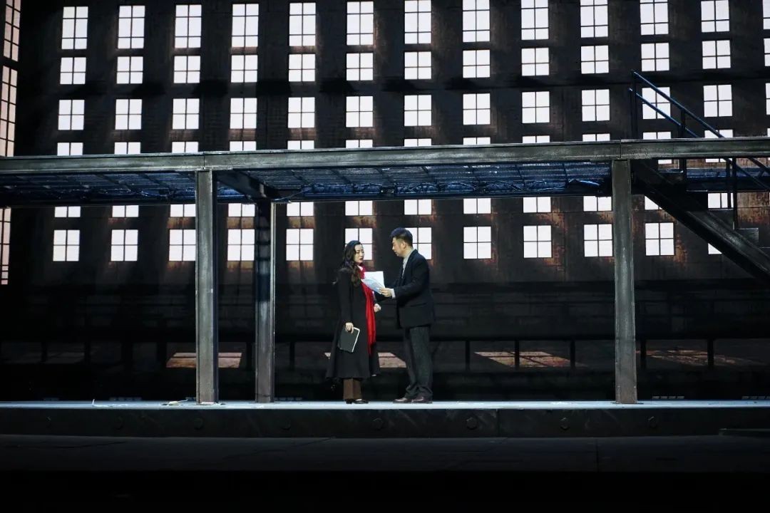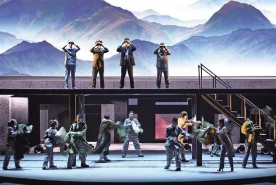 作为一部展现军工科技图景的作品,《红箭 红箭》在舞台呈现方面大胆突破。舞台结构是高度提炼过的、富有象征意味的空间语汇,而不是深山密林里的几间水泥房子。舞美风格采用了结构性的语言,在不同场景的氛围和质感营造上运用多媒体设计和灯光设计结合空间赋予舞台生动、饱满的视觉形象。