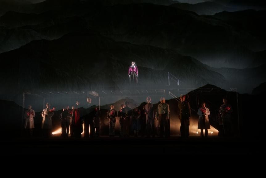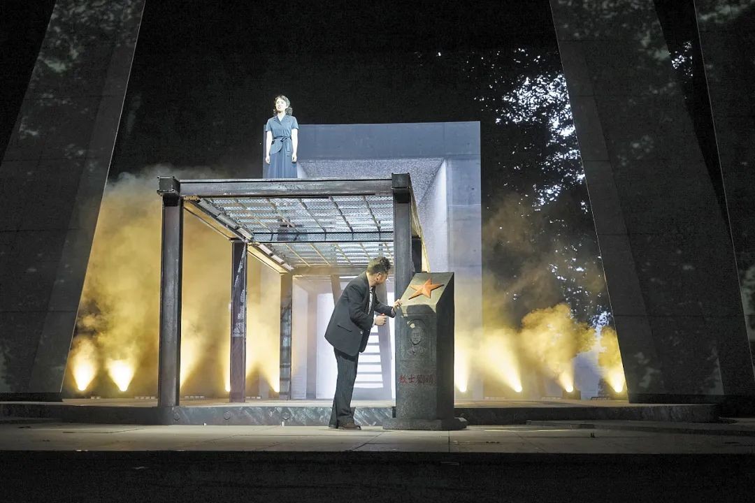 横向,则设计了生者和逝者交错的双重空间。这样的空间是为了充分抒发人物的感情,让人物在这个事件的发展过程当中,能够深刻地揭示他们的内心的情绪,反映他们内心的思想活动,更深刻地渲染人物的情绪,塑造出富于人性和生命力的人物形象。