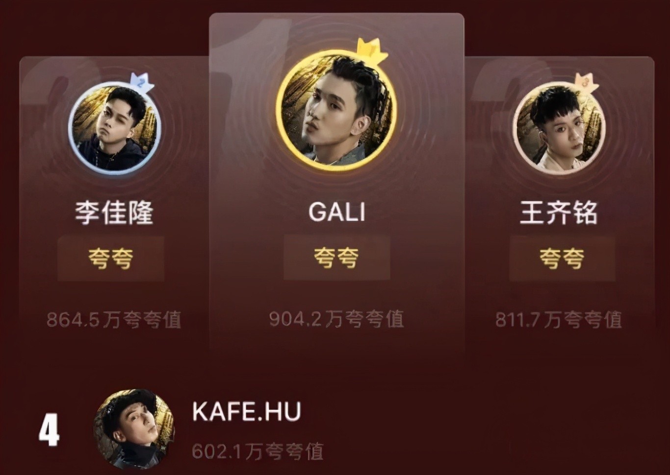 而在已经播出的四强LIVE SHOW中,几位rapper得到的票数也将作为总决赛首轮的一部分成绩。从目前四位rapper的得票来看,GALI拿到最高的904.2万票,李佳隆和王齐铭跟GALI差得也不多,唯独Kafe.Hu只有别人的三分之二,而根据录制的情况看Kafe.Hu的确第一个出局,剩下的四强将开启2对2的模式,GALI对战李佳隆,王齐铭对战李大奔,说实话走到4强其实没有混子了,就像当初的黄旭,走到4强大家都说他打感情牌,而现在的他的实力却让当初质疑他的人闭嘴,无论外界怎么评价王齐铭,甚至骂他是混子,但实话实说他还是有点东西。