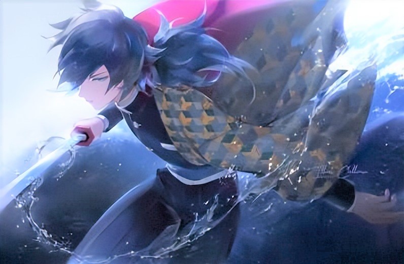 水柱,使用“水之呼吸”。日轮刀刀身颜色为 蓝 色,很符合水之呼吸的特性,刀锷部呈龟甲状(六角形),整体是颜色基调有白、黑、紫红色4个颜色。