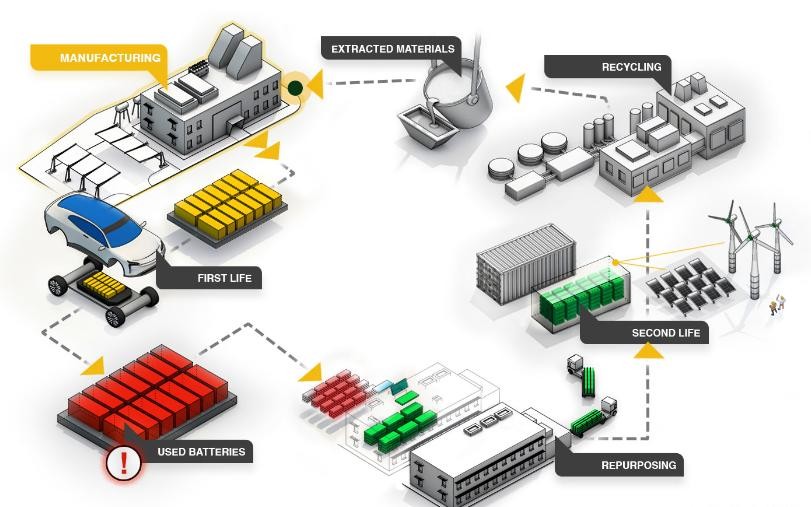 如果电池已经损坏,或者余能不足了,就需要转为再生利用了,将电池里有价值的金属、电解液、塑料等回收,并重新制作成为电池或其他产品的原料。