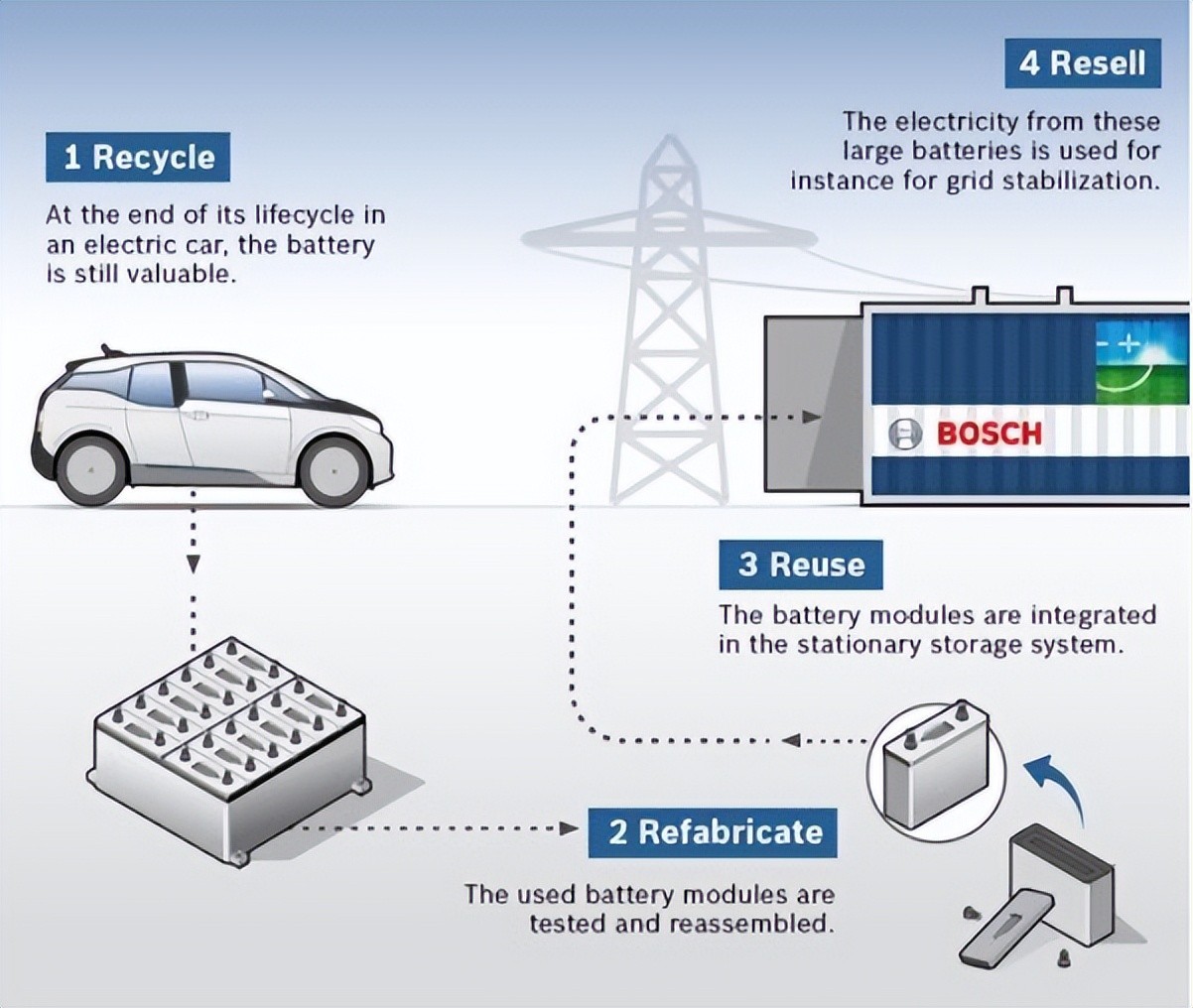 目前国际上针对废旧电动车电池的回收利用分为两种,梯次利用和再生利用。