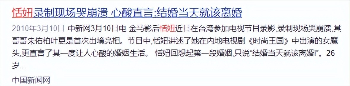 资料参考:2010-03-10中国新闻网——恬妞录制现场哭崩溃 心酸直言:结婚当天就该离婚