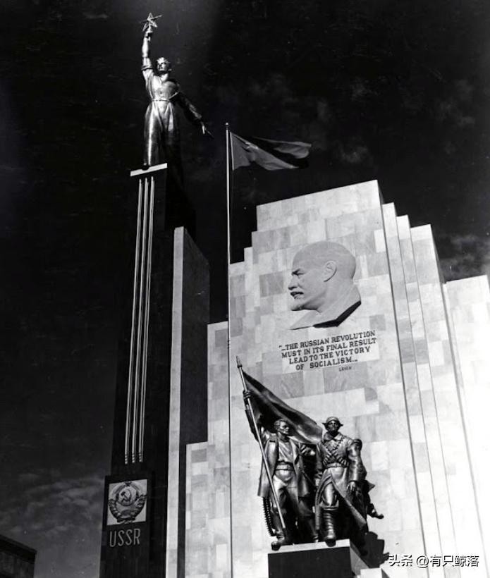 14 1939年,美国在纽约举办了世界博览会,共有64个国家,参加了这一届的世博会。照片中是苏联的展览馆,除了有苏联红旗,五角星,以及工人的形象之外,展览馆的主题建筑上,还刻着苏联领袖列宁的头像。