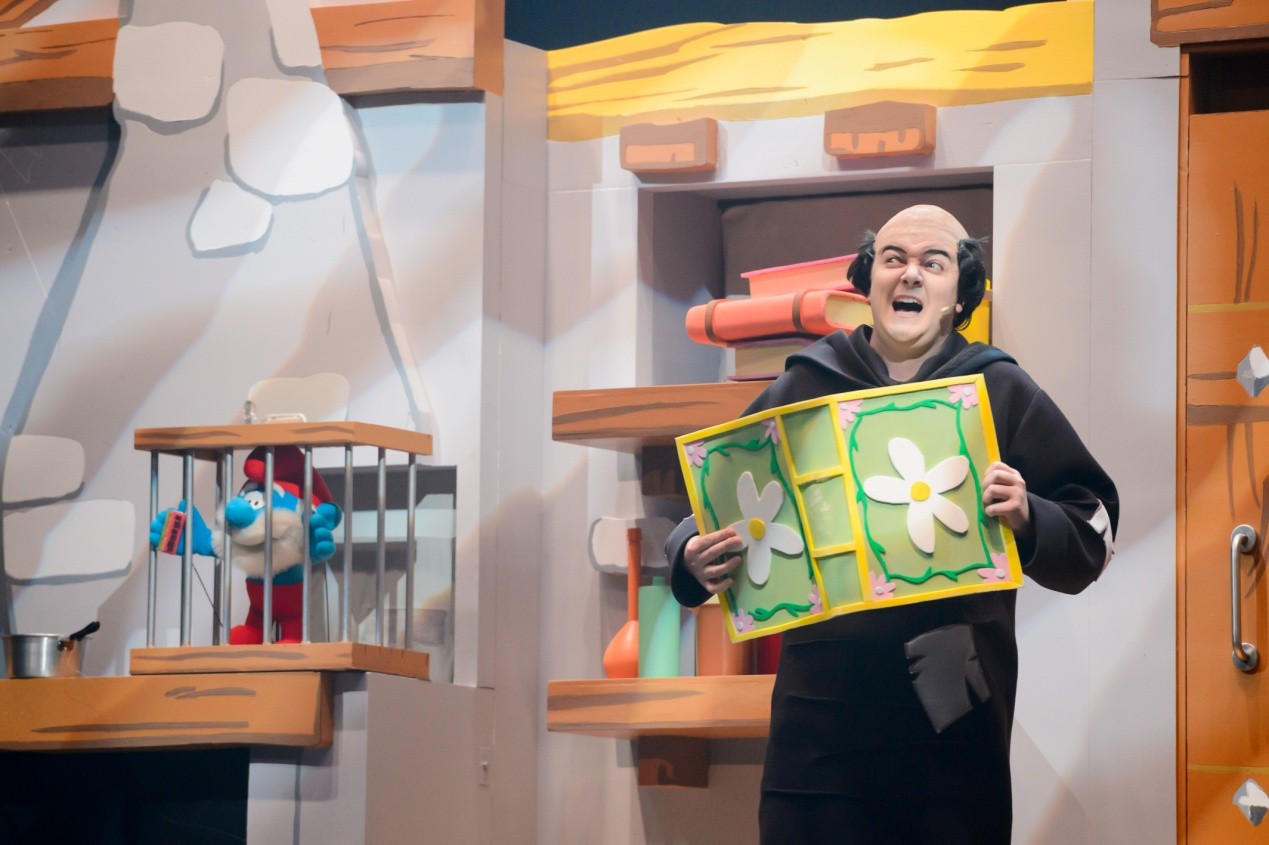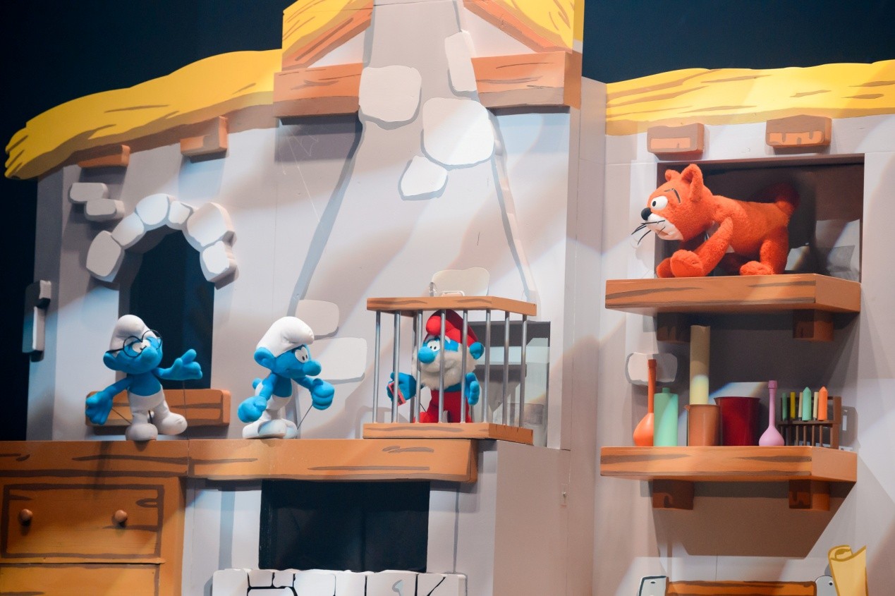 在蓝精灵大战阿兹猫的环节,一群“小矮人”蓝精灵战“巨人”格格巫的场景,小小的提线木偶和真人之间的巨大反差让观众捧腹不已。因为真人偶和提线木偶制作工艺品质惊人的一致,你会产生蓝精灵突然变大突然变小的错觉。