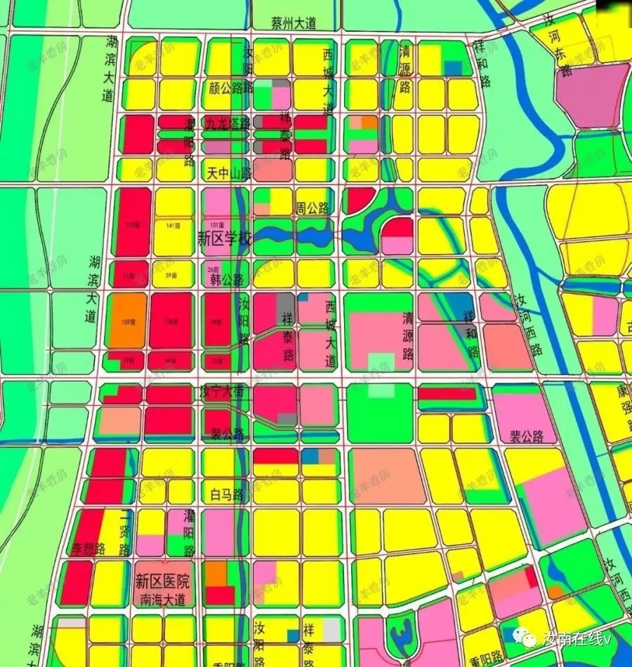 汝南县湖滨新区位于汝南县老城区西侧,规划范围北起蔡州大道,南至重阳路,东至汝河,西至湖滨大道,规划面积12平方公里。目前新区内已经建成四横(汝宁大街,裴公路,白马路,南海大街),五纵(湖滨大道,西城大道,清源路,祥和路,汝河西路)等九条路,道路框架已经形成。如下图,(黄色代表居民居住用地,暗红代表商业,粉色代表市政医院,学校等。)