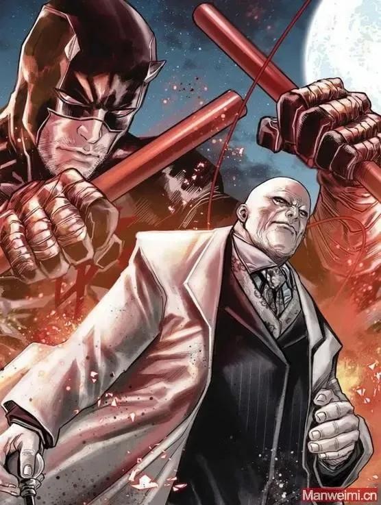 然而,威尔逊最大的对敌人还是夜魔侠,又名马修·默多克(Matthew Murdock)。律师出身的地方检察官默多克多年来一直致力于打击纽约头号黑帮分子做出了巨大的努力。作为一名蒙面义务警员,默多克还加入了捍卫者联盟,与卢克·凯奇、杰西卡·琼斯和铁拳——作为一个团队向威尔逊发起战斗。