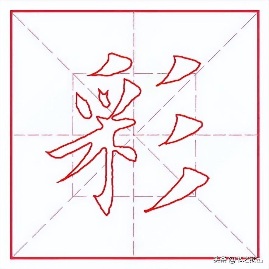 右部三个撇笔的起笔角度以及行笔走向皆有不同,切忌联排。首撇稍重,角度稍平;第二撇位于首撇的正下方起笔,短促有力;最后的撇笔起笔位置稍靠右,撇身略长。