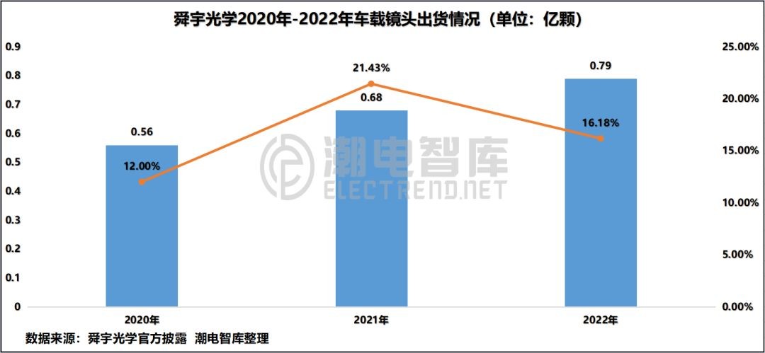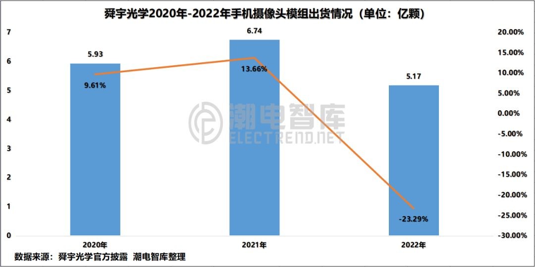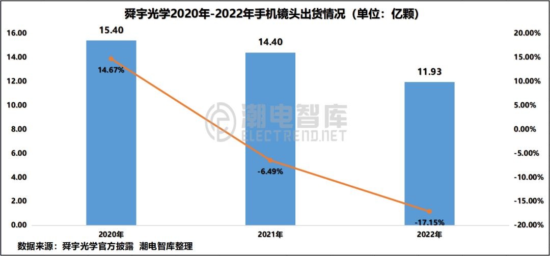 根据潮电智库统计,2022年全年舜宇手机镜头出货量为11.93亿颗,为近三年新低。