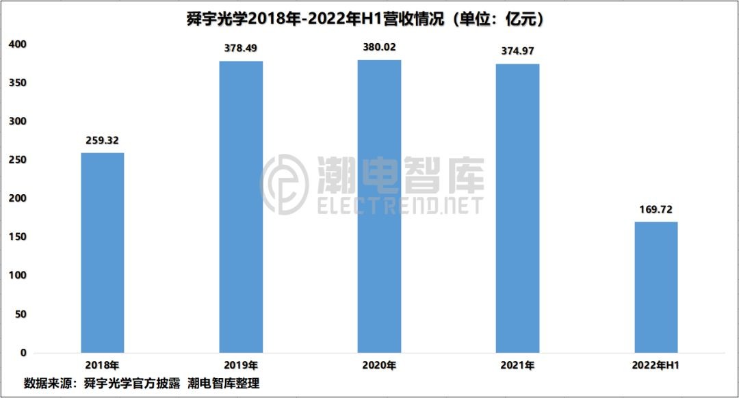 公开数据显示,2019年舜宇总营收为378.49亿元,较2018年约增46%;2020年总营收为380.02亿元,较上年基本持平;2021年总营收为374.97亿元,十年来首次下滑。
