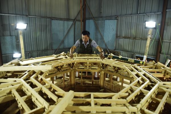 ↑6月18日,应县农民赵玉山在建造微缩版应县木塔。