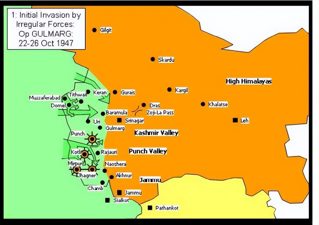 印巴的争夺战在克什米尔当地,也引起强烈反应,当地印度教徒与穆斯林也随之展开大规模武装冲突,1947年8月-9月,在蒙巴顿方案提出后,当地印度教徒与穆斯林展开大规模武装冲突,20万穆斯林居民在冲突中丧生,此事引起了巴基斯坦方面的极大怒火,10月下旬,2000余穆斯林部落武装分子徒步或骑摩托车从北、西和西南分三路进入了克什米尔,迅速占领许多克什米尔许多重要据点,并逼近首府斯利那加(srinagar),哈里·辛格见势不妙,向印度求援,10月26日,克什米尔正式达成加入印度的协议,次日,印度即向克什米尔派出军队,巴基斯坦见状,不甘示弱,也派出以部落武装为主的军队进入克什米尔,至此,战争爆发。