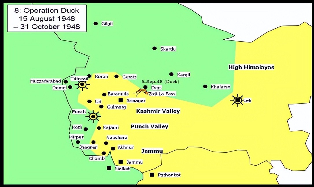 在克什米尔北部,激烈的战争仍在如火如荼地进行。在克什米尔北部,巴基斯坦民兵得到了吉尔吉特(即唐朝时期的“小勃律”)和奇特拉尔的支援,站稳了脚跟,到了1948年5月,克什米尔北部的巴基斯坦部队开始南下,向克什米尔腹地发起进攻,他们首先攻占了卡吉尔(kargil),随后兵分两路,向东西两个方向攻击前进。在东部,巴基斯坦民军占领了哈拉策后继续东进,于7月2日进抵克什米尔东部的战略城市列城(leh)城下,试图攻下列城,如此能把控制力延伸到克什米尔西部的整个拉达克地区。在西部,民军攻占了离卡吉尔49公里的德腊斯(Dras),前出至离斯利那加不足199公里的乍吉山口(zoji-la pass)。印军固守列城、乍吉山口,与巴基斯坦民军展开了激战。(见地图).乍吉山口是喜马拉雅山脉的一处隘口,也是喜马拉雅山脉的最低点,地势险要,只有一条羊肠小道。一夫当关万夫莫开,也列城通往斯利那加的必经之路。如乍吉山口沦陷,巴军则可长驱直入,直捣斯利那加,后果不堪设想。但巴军推进迅速,此地守军薄弱,无法抵挡,7月7日,乍吉山口被巴军攻占。残存印度守军撤退,与主力部队会合,企图乘巴军立足未稳,夺回乍吉山口。