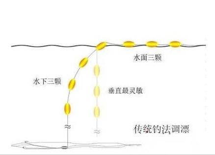 以第二颗漂豆为基点,调整漂豆间距,然后均匀上推漂豆,直到有三颗出水,第四颗半豆入水,半豆出水。如果我们想要钓灵,可以将漂豆之间间距缩短,当第四颗漂豆几乎垂直水面时,钓组最灵,当第四颗漂豆横躺在水面,大半露出时,钓组最钝。