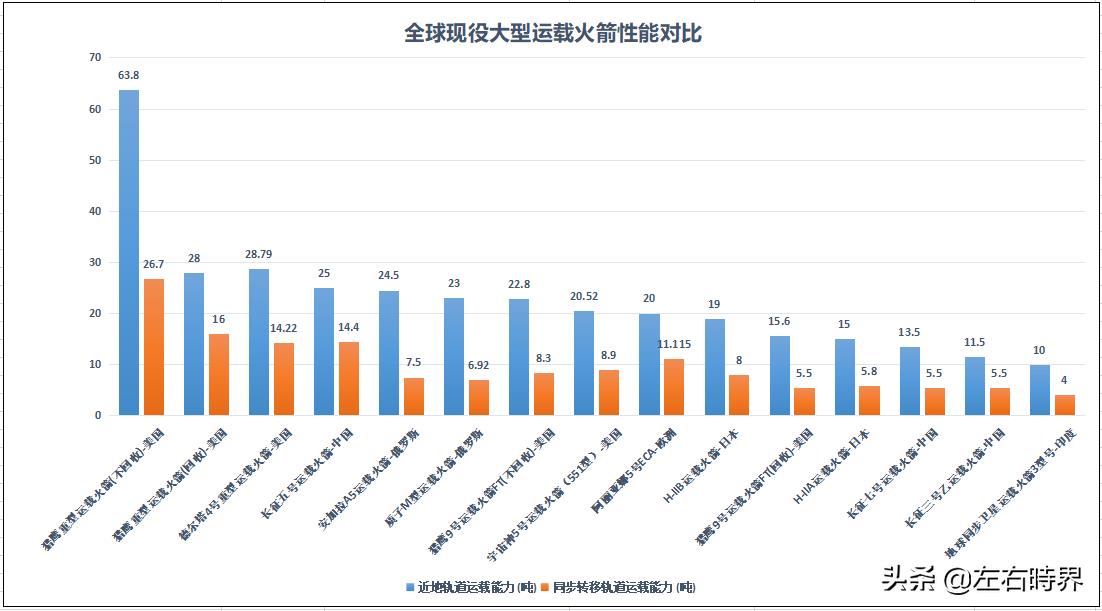 全球现役大型运载火箭近地轨道和同步转移轨道矩形图
