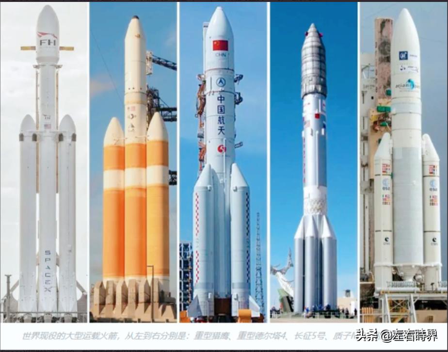 从左到右分别是:重型猎鹰、重型德尔塔4、长征5号、质子M、阿丽亚娜5火箭