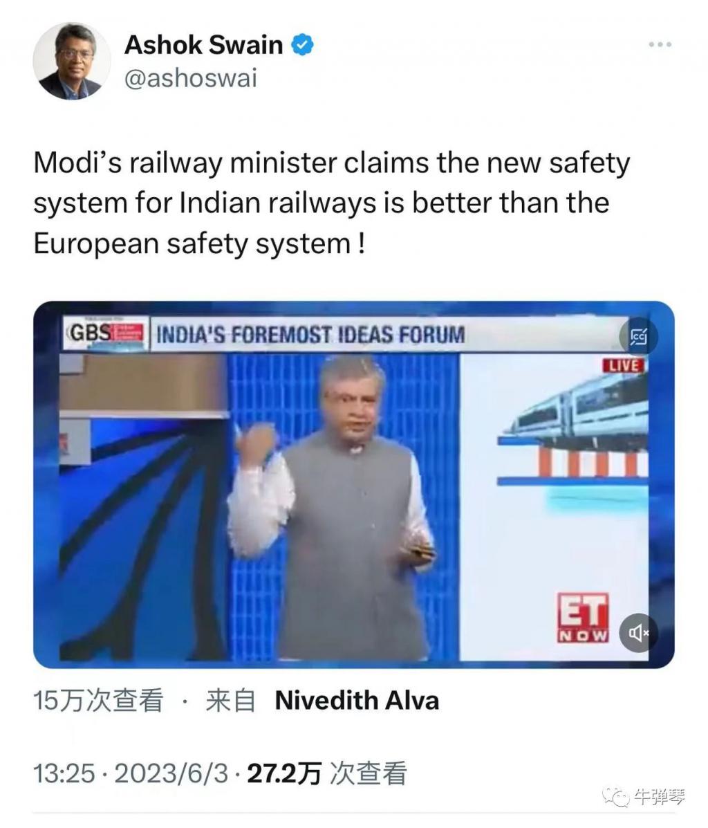 看印度人就悲愤地痛斥,印度铁路部门只知道吹,导致悲剧一再发生。比如,有印度网友就贴出印度铁路部长的之前视频,宣称印度铁路的新安全系统,比欧洲的还要出色。