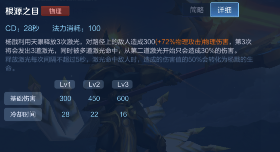 杨戬的大招可以将对目标造成的50%伤害转化为自身的生命值,一共可以发射3道激光,这个技能会根据技能造成的伤害来计算回复的生命值,所以通常杨戬特别喜欢与敌人在兵线上作战。
