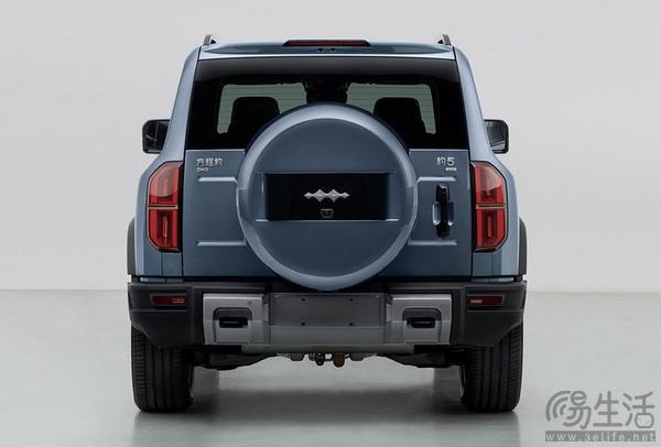 豹 5 的车尾部分同样采用方正的线条,同时其尾门也采用侧开的方式,门上还带有外挂式备胎,整体视觉效果粗犷而硬派。此外,其纵向布局的尾灯组采用电极环扣设计,点亮后的辨识度相当不错。