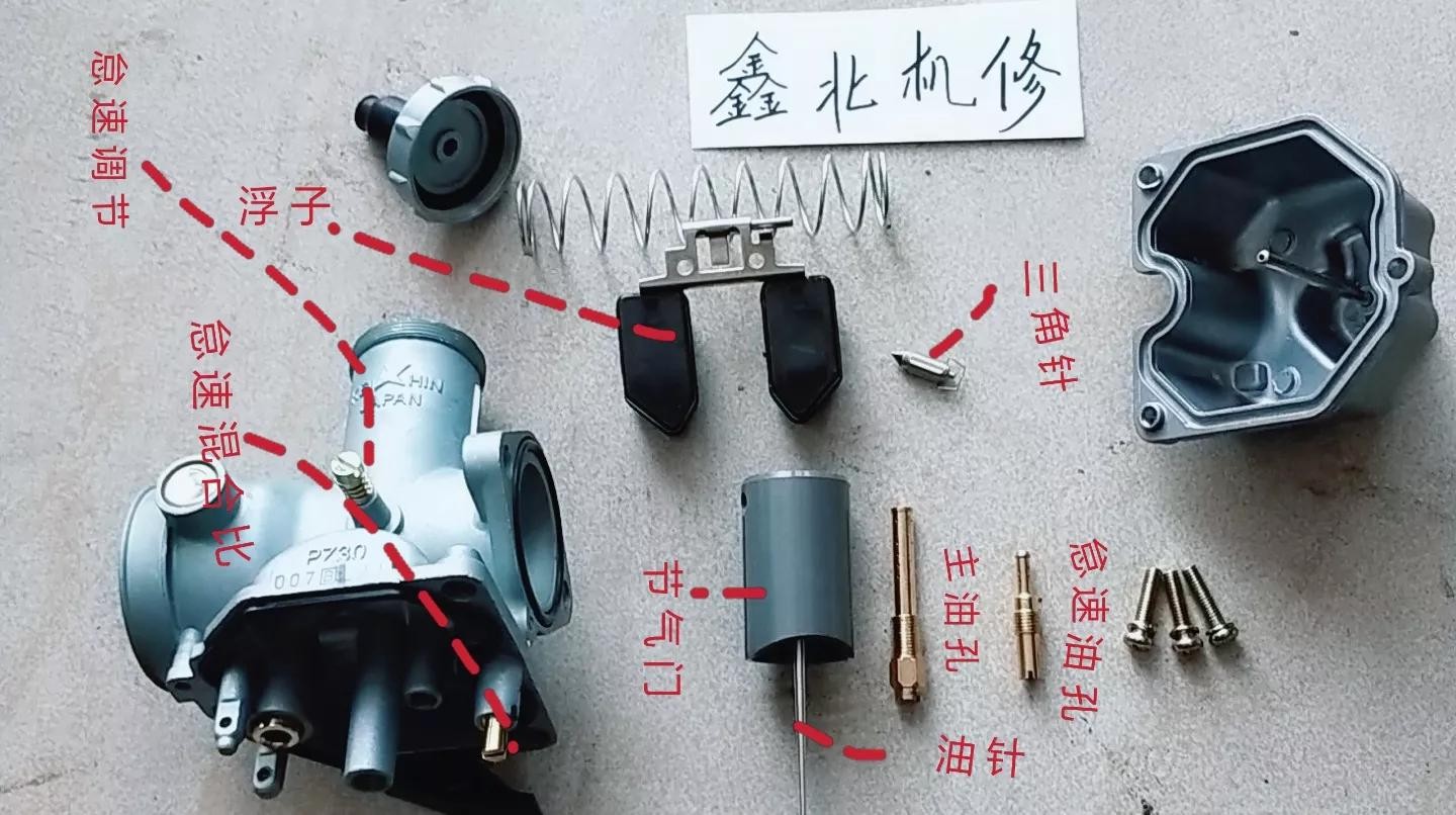大家好这里是鑫北机修。这期文章来了解一下化油器的基本构造,怠速及混合比的调解。以上图CG 125的化油器为例,了解一下化油器的基本构造。当摩托车出现加油不顺畅,长时间不骑的情况下,可以按照每个部件进行拆卸清洗。