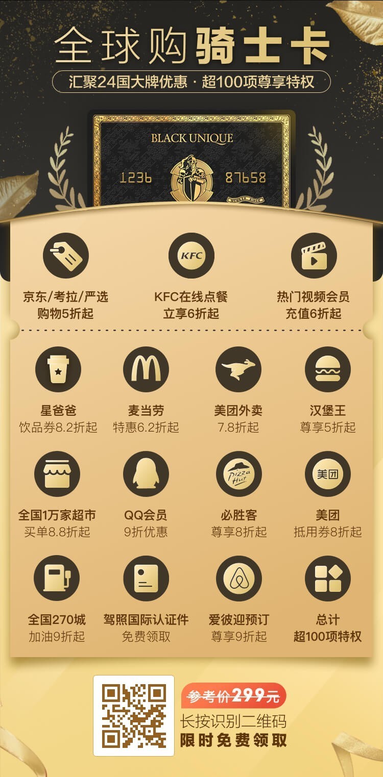 全球购骑士卡[1]是国内首张以骑士来命名的汇聚海内外购物折扣、会员专属特权的综合权益卡[2],集合了全球购特惠、城市生活尊享特权和在线商城的尊享特权。骑士尊享特权基于移动互联生活方式,打通线上、线下消费场景,汇集时下热门、高频的商品及服务优惠,与屈臣氏、奈瑞儿等合作[3]。