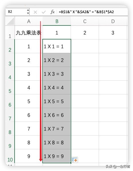 上面的公式中向下填充时行不变,始终引用的是第一行中的数字B$1。