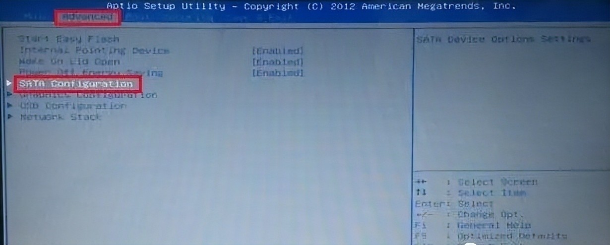 1、重启电脑,待出现开机画面后按快捷键F1、F2或Del键进入到bios启动项设置界面,通过键盘上的左右方向键将光标移动到“Advanced”,然后再按上下方向键选择“SATA Configuration”,按回车键确认,如下图所示: