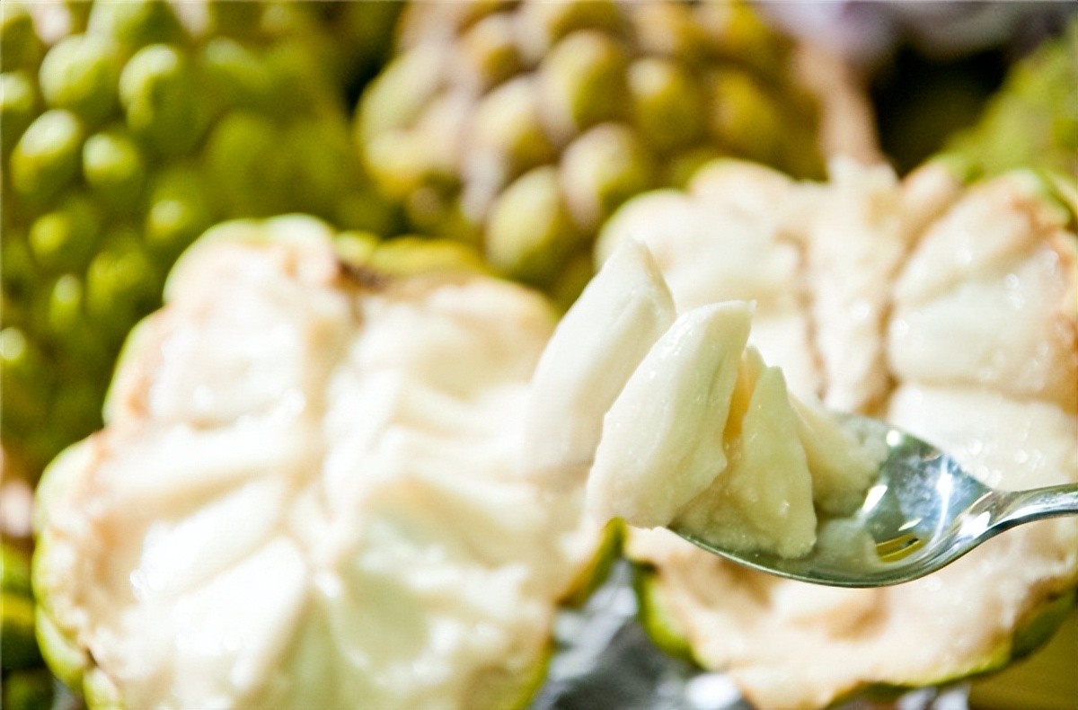 成熟的释迦果当真是世界上最甜的水果,没有之一!冰淇凌口感,嫩滑绵软,香甜软糯,咬起来又有点Q弹,冰镇一下口感更佳。半生的释迦果吃起来有点生涩,酸酸甜甜,口感有点像菠萝。