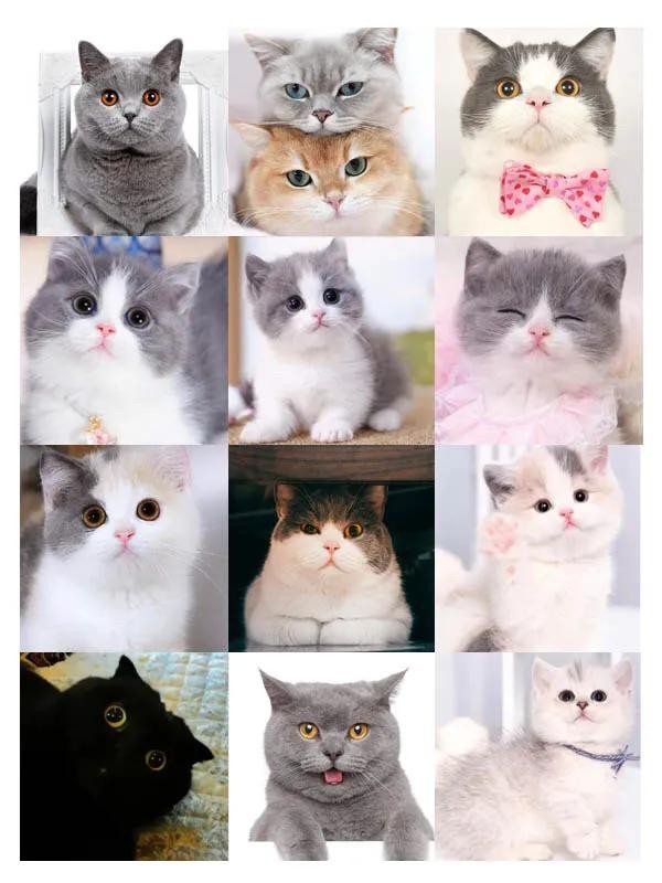 毛色:共有十五种品种被承认,其中最著名的是蓝色系的英国短毛猫。