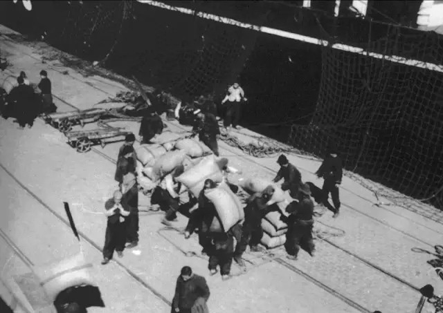 在日本殖民统治期间,大连港的吞吐量最高时达1000多万吨,当时机械化装卸设备很少,装卸作业主要靠人挑肩扛。在繁忙季节,大连港每天需要出动一万多人,平均每人每天要搬运10吨以上的货物。什么货物都得人扛,有粮食、豆饼、矿石、钢铁、炮弹等,甚至还有运回本土的日本人的尸体。豆饼每片重约23公斤,每人每次得扛4到6片,劳动量非常大。