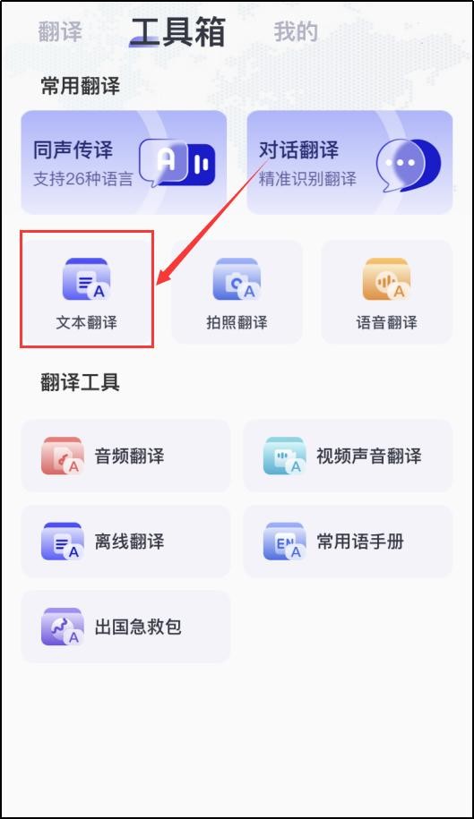 步骤一 我们下载手机版【智能翻译官】,我们使用【文本翻译】功能来将中文翻译成英文,点击【文本翻译】。