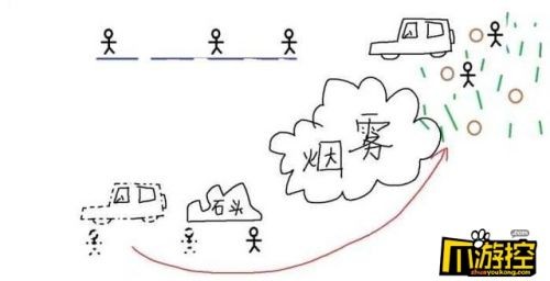 怎么拉枪线呢?就是在与敌人对峙的时候,你从侧面迂回,达到敌人的侧面或者后面,可以让队友与敌人对峙的时候,你能够打到敌人的侧身,让敌人四处受敌。如下图,队友与敌人对峙,通过烟雾,拉到敌人侧面,那么敌人如果和正面队友开火,那么你可以打到敌人侧身,如果敌人对你们开火,那么队友可以打他们侧身,这就是拉枪线的好处。