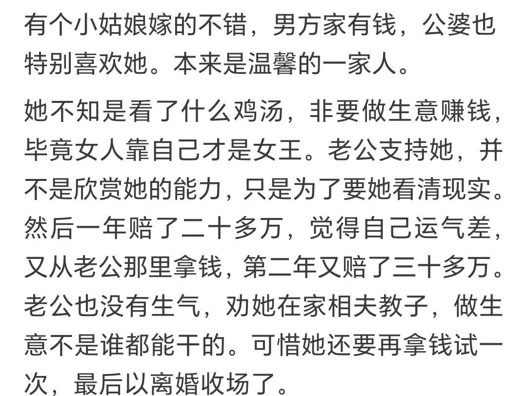 不赔点钱,有些人永远认不清现实,总觉得自己是经商的天才,总觉得可以躺着数钱,有些店铺开几个月,最多一年就关门了,大概就是如此,有人认为男方的经济实力不够,不应该怪在女方身上,有人则认为是女方太作了,踏踏实实工作几年难道不好吗?