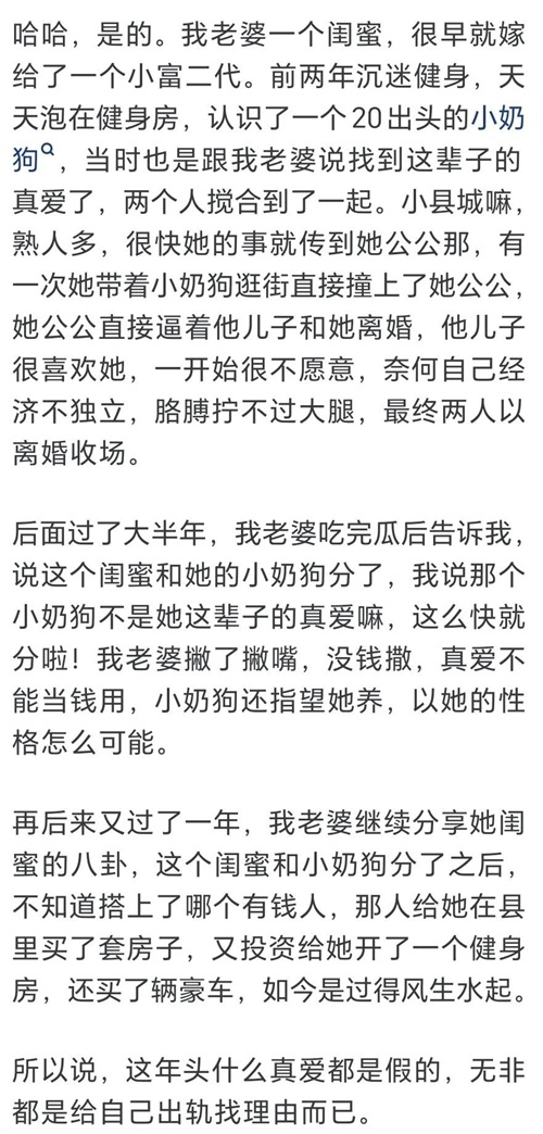 哎,看到这位网友的描述心理真的是五味杂陈呀,人的欲望果然是无止无境的,但是人无完人啊,要看到身边人的优点,懂得珍惜身边人才是婚姻长久的秘诀啊