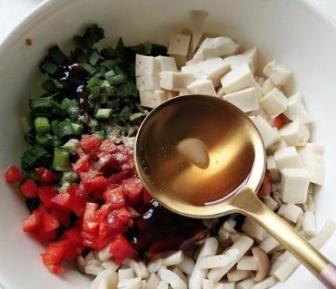 3、韭菜、蟹味菇、红彩椒洗干净后切碎,豆腐也切碎和虾皮放在一起搅拌均匀,再淋入一勺蚝油、一勺猪油、2克胡椒粉和一克白糖搅拌均匀。