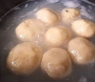5、锅中倒适量水烧开,把做好的糯米团放入水中,中小火煮8分钟左右关火,一碗好吃的落水包就做好了,吃的时候放点猪油在上面,也可以烫一点蘑菇和青菜在碗里点缀一下哦。