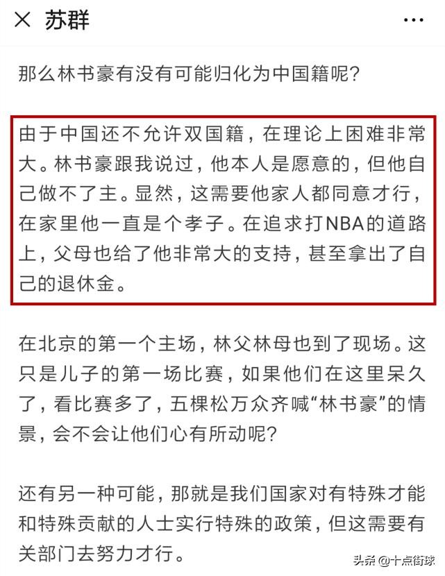 而在加盟北京首钢之初,林书豪也在接受记者的采访时表示,只要中国男篮有需要,他自己非常乐意代表中国男篮参加比赛。不过根据苏群最新的一篇关于林书豪的文章里讲到,目前林书豪加入中国男篮最重要的阻碍就是林书豪的父母,由于林书豪是个孝子,从话里可以看出他的爸爸妈妈不同意林书豪放弃美国国籍,这就导致林书豪迟迟无法完成归化,加上林书豪本就是非常孝敬父母的一个人,因此他才没能在目前完成归化中国男篮的手续。