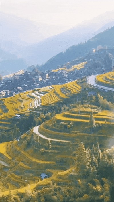 梯田间的山村、散落的吊脚楼,