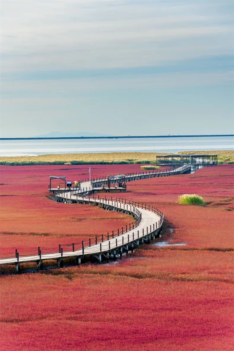 蜿蜒栈道旁,艳红碱蓬铺展似柔软红毯,