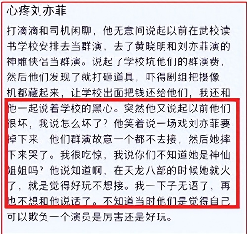 有网友爆料,刘亦菲在打车时曾遇到过那个群演,那个群演对未成年的她竟然抱着玩味的态度,毫无尊重。