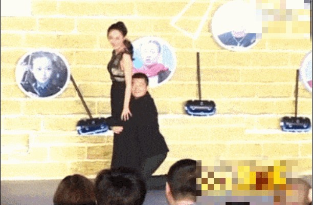 他不仅把头靠在女方的肩膀上,更是跪在女方的身后,将头靠在女方的臀部。他的双手紧紧地抱着女方的大腿,这种种的举动,看似为新戏宣传,实际上却像是在骚扰女方。