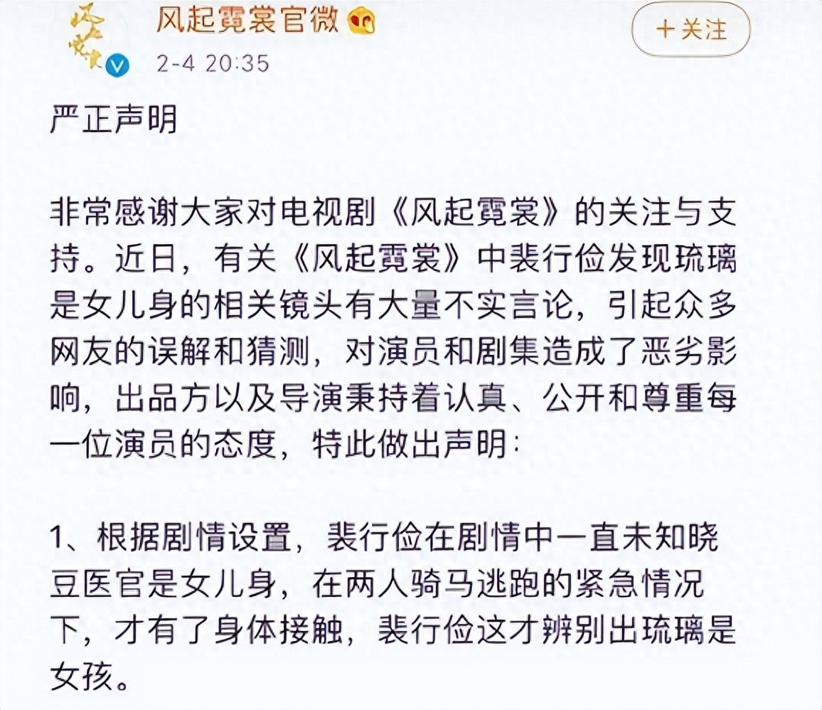 然而,剧组迅速对此发表声明,表示这一行为是出于剧情需要,为的是顺利引入女主隐藏的女儿身身份。然而,这份声明不久后便被删除,让人觉得事有蹊跷。