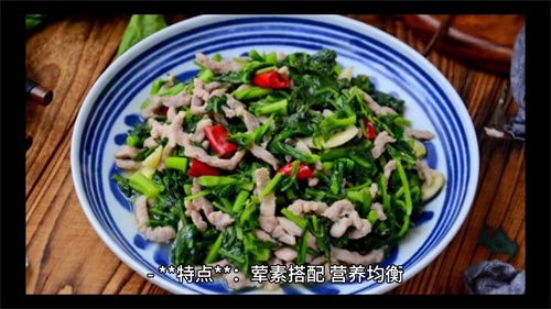 ·7.荠菜炒肉丝做法:荠菜洗净焯水后切段,猪肉切丝,锅中放油,先炒肉丝,再加入荠菜翻炒,最后加盐、酱油调味。特点:荤素搭配,营养均衡。