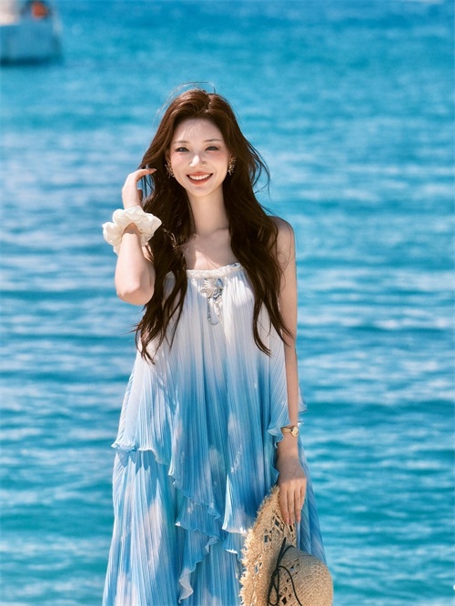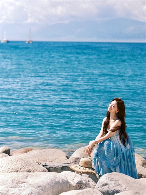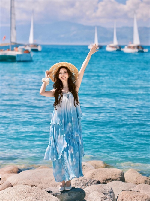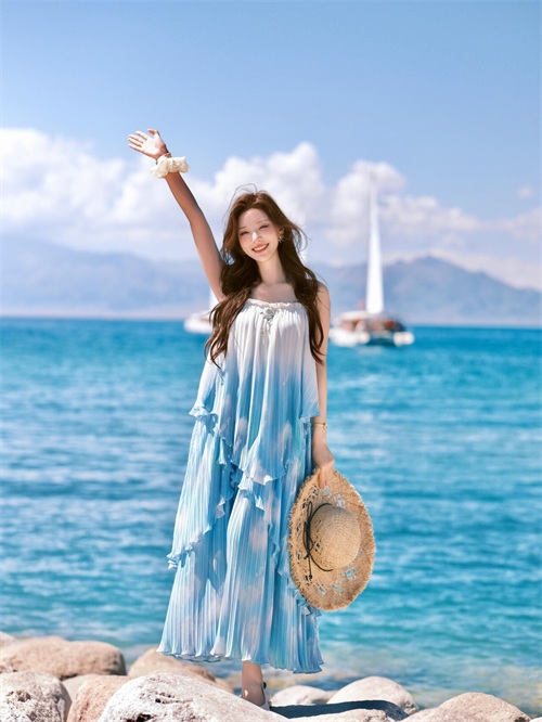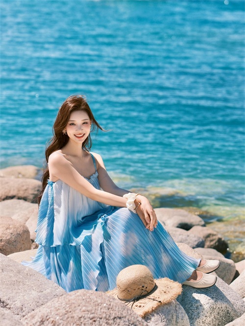 如果是穿着裙子拍照,我们可以一手提裙摆,另外一手拿帽子,这样的姿势一来能够展现出裙摆的飘逸感,二来也能增加画面的层次感,尤其是在微风轻拂的时候,这种动作会显得格外优雅,随手一拍都好看。