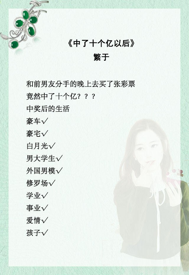 短评:现实向苏文,女主的前男友找了白富美抛弃了她,女主一气之下买了张彩票,没想到中了整整十亿的大奖。女主一开始只是一个比较拎得清的普通人,悄悄取钱辞职买房花小钱钱,随后一夜暴富让她陷入了迷茫,为了弥补校园时期的遗憾,女主参加校庆靠近男神。