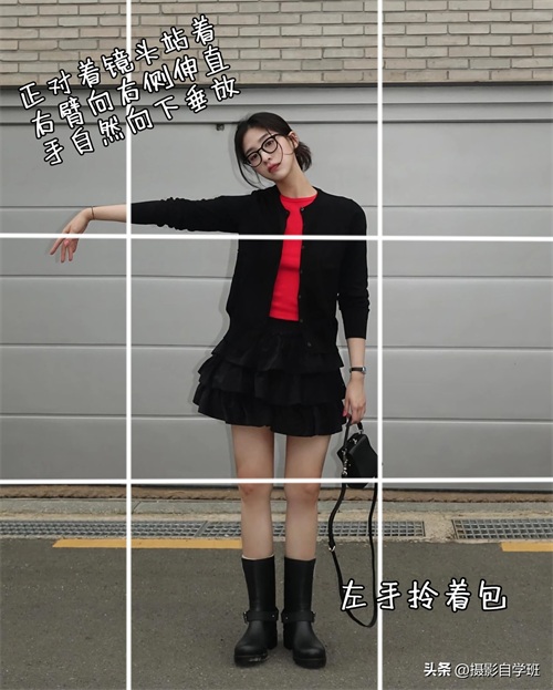 对于初学者来说,正对镜头站着是一个常见的选择。此时,你可以尝试轻微扭动胯部,为照片增添一些动感。右肩膀挎个包,不仅增加了整体造型的层次感,还能让手部动作更自然。两手自然下垂,保持放松状态,让摄影师从侧面捕捉你的侧脸和轮廓。