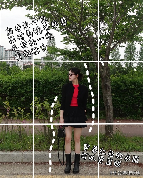穿着黑色外套和红色T恤的组合,在色彩上形成了鲜明的对比。右手拎着包,正对着镜头站着,但侧头看向远方。这样的姿势不仅展现了你的个性魅力,还通过色彩对比让照片更加引人注目。摄影师可以注意捕捉你与背景的互动和色彩对比效果。