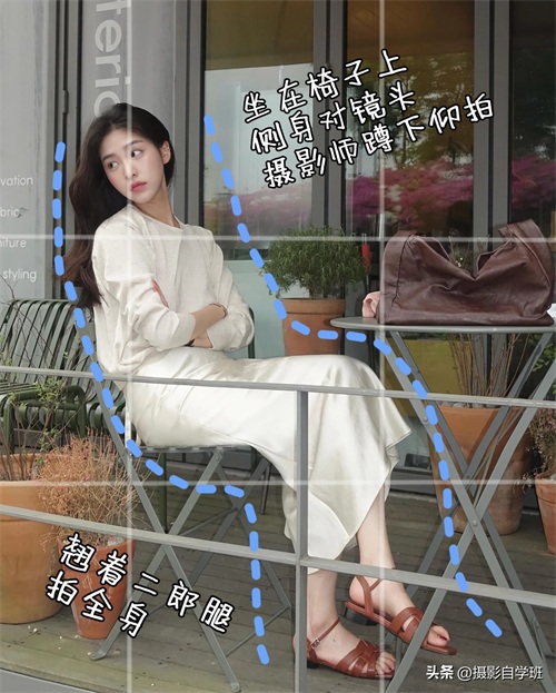 坐在街边小店窗外的椅子上,翘着二郎腿,侧身对镜头。这样的坐姿既舒适又惬意,非常适合拍摄休闲风格的照片。回头往后看时,记得要自然放松,不要过于僵硬。摄影师可以从下往侧拍的角度捕捉你的侧脸和腿部线条。