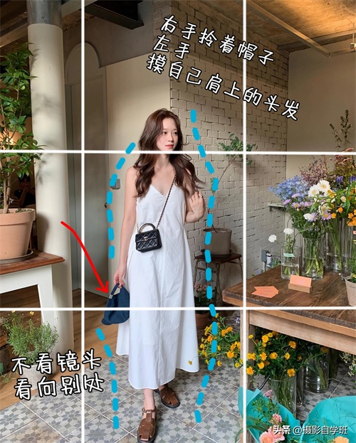 拍摄全身照片时,你可以右手拎着帽子,左手抚摸肩膀的长发,向前慢慢迈步走。这样的动作既随性又自然,非常适合拍摄街头和街边小店风格的照片。摄影师可以跟随你的步伐进行抓拍,捕捉你走路时的动态美和表情变化。